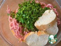 4. К фаршу добавить хлеб, размоченный в молоке, рубленную петрушку, яйца, соль, перец и размешать.
