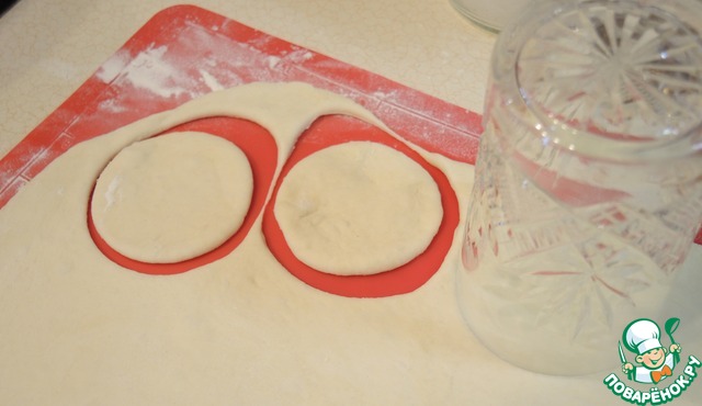 Тесто раскатываем в пласт толщиной 3-4 мм и вырезаем одинаковые кружочки диаметром примерно 5 см.