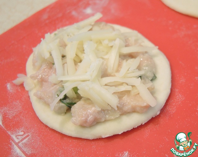 Каждый кружок теста намазываем фаршем (много не накладываем, иначе не удобно будет сложить), посыпаем натертым на мелкой терке сыром.