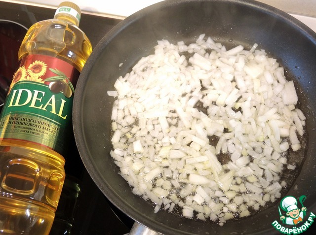 Растительное масло "ИДЕАЛ" (микс оливкового и подсолнечного) нагреваем на сковороде и обжариваем на нем нашинкованный лук и чеснок.