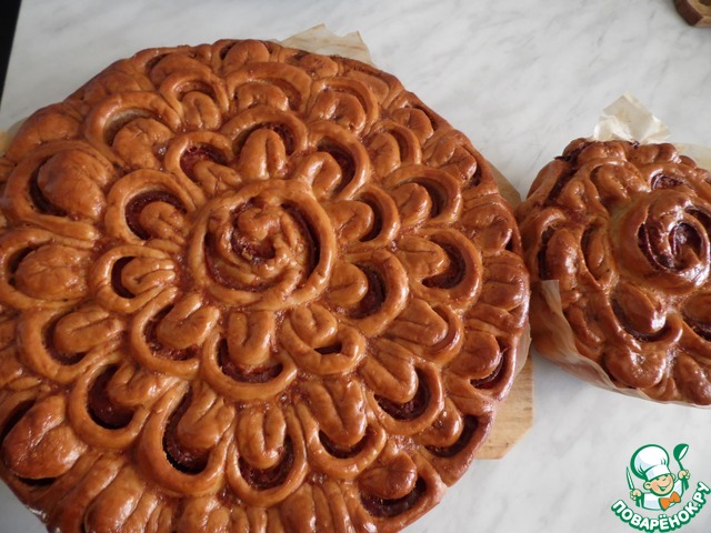Вот такой цветок у нас получается. Смазваем его яичным желтком, смешанным с небольшим количеством сливок. Ставим пирог выпекаться в предварительно разогретую до 180 градусов духовку на 35-40 минут.