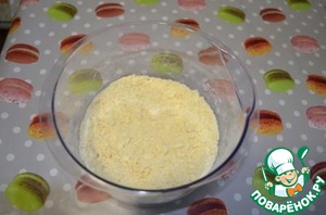 Сливочное масло комнатной температуры растереть с сахаром и разрыхлителем. Вмешать муку так, чтобы получились жирные крошки. Убрать в холодильник на время приготовления начинки.