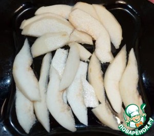 Грушу очистить, разрезать на четвертинки, вырезать серединку и затем порезать на дольки.