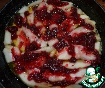 Сверху залить клюквенным соусом. Равномерно посыпать оставшимся сахаром.