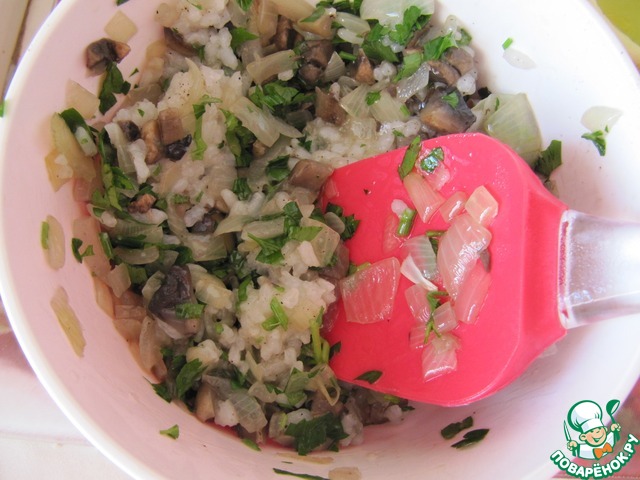 Для начинки смешайте рис, обжаренные грибы и лук, добавьте рубленую зелень, посолите, поперчите и перемешайте.