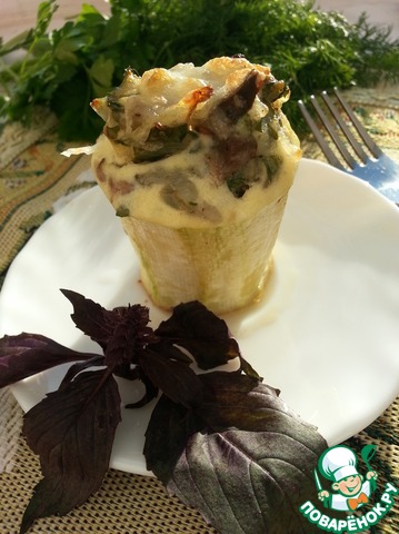Наполните половинки кабачков приготовленной начинкой, залейте смесью сметаны с яйцом и запекайте 15 минут