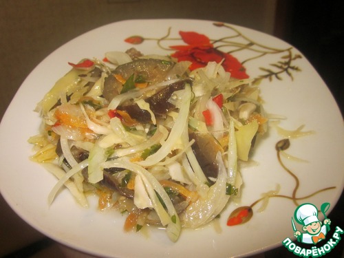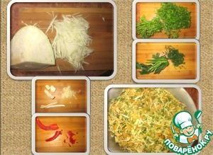 Капусту нашинковать, зелень порезать, коренья и чеснок натереть на мелкой терке, жгучий перец порезать. Добавить пережаренные овощи. Овощную смесь чуть присолить.