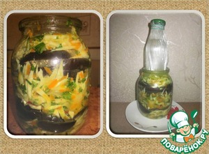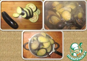 Баклажаны нарезать кружочками и отварить в рассоле (1 литр воды 30 гр соли ) до полуготовности. Дать стечь воде. -