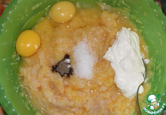 • Добавляем яйца, специи, соль, майонез (или сметану)... и хорошенько всё перемешиваем.