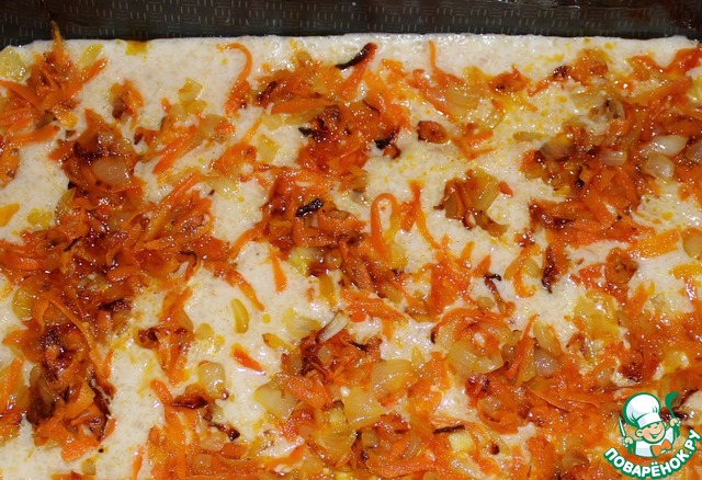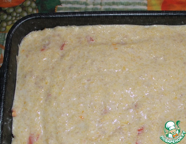 • Выливаем в форму для запекания (в противень)половину кабачковой массы и по верх её зажарочка...