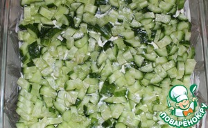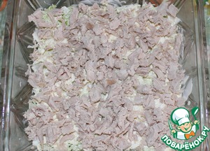 Салат укладываем слоями, смазывая каждый слой майонезом. Первым слоем у нас идёт капуста...