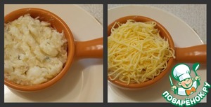 Раскладываем по формочкам ( примерно 6 шт.) или в одну большую. Уверяю вкус от этого не изменится. Посыпаем с верху тертым сыром.