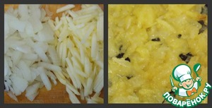 Лук и тыкву мелко режем. На сковороду наливаем масло и добавляем сливочное. Нагреваем и кладем наши порезанные овощи. Обжариваем до готовности.