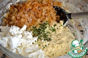 5. Добавить жареный лук с розмарином и раскрошенный козий сыр и размешать все еще раз. Размешивать с минимальным количеством движений, аккуратно.