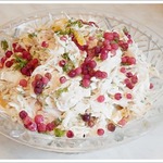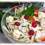 Осталось все ингредиенты заправить соусом, поперчить, по необходимости подсолить, перемешать, добавить горсть свежей клюквы.