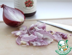 Очистить небольшую красную салатную луковицу и нарезать на четвертинки.