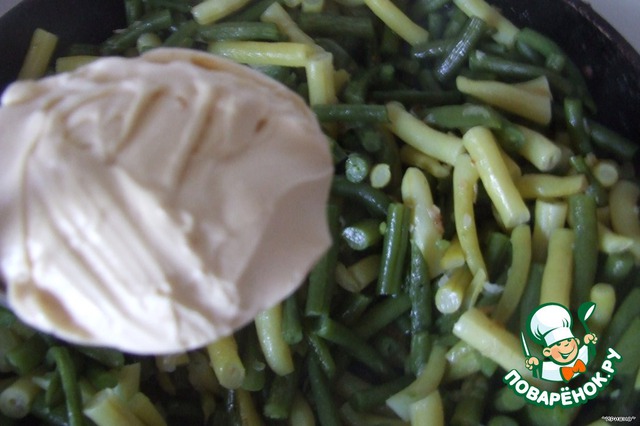 • Фасоль слить и выложит в сковороду с луком. Добавить сметану. Все хорошо перемешать. оставить на слабом огне примерно на 2 минутки.