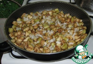 Жаровню (сковороду) с толстым дном диаметром 35 ‒ 38 см с высотой края примерно 6 см смазать растительным маслом. На низ положить порезанные кубиками кабачки, порезать одну головку лука и 1 ‒ 2 шт. болгарского перца (можно без перца).