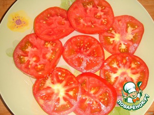 Спелые помидоры нарезать тонкими кружками и выложить на тарелку.