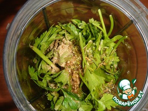 В блендере приготовить соус из орехов, зелени (я брала петрушку и тархун), оливкового масла и пряностей (сухие травы, перец).
