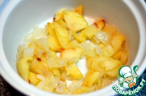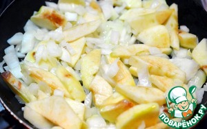 Отдельно на сливочном масле обжарьте нашинкованный полукольцами лук до прозрачности. Антоновку очистите от семян и кожуры, нарежьте на дольки, добавьте к луку и тушите еще 5 минут.