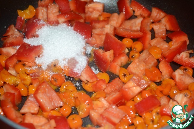 Поставить на огонь рябину и перец, добавить сахар, подсолнечное масло, довести до кипения. Как закипит, варим помешивая 1 минуту на сильном огне.