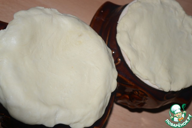 Раскатайте тесто, разделите на 3 квадрата и накройте горшочки.