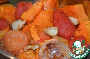 Противень застелить фольгой, выложить на него тыкву, лук, зубчики чеснока в шелухе и целые помидоры. Сбрызнуть маслом и посыпать розмарином. Поставить в разогретую до 220*С духовку на 35 минут. В середине запекания перевернуть. -