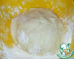 Примерно через час тесто поднимется. Обмять его и выложить на стол. При необходимости можно добавить муку. Но тесто должно быть влажным, не тугим.