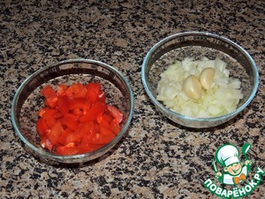 Лук порезать мелко, перец - небольшими кубиками. Измельчить чеснок.