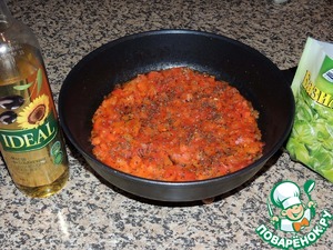 Добавить помидоры и перец, базилик и потушить 7-10 минут.