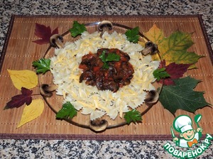 А если проще - макароны-бантики с томатно-грибным соусом. Это очень аппетитное, сытное, простое и какое-то особенно осеннее угощение. Довольно необычное сочетание грибов и помидоров становится в нем идеальным.