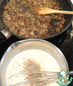 Пока грибы обжариваются, приготовим соус "Бешамель". Для этого в сотейнике растопим сливочное масло, добавим муку и будем обжаривать минуты 3-4, затем тонкой струйкой вольем сливки, при этом нужно энергично все перемешивать венчиком, дождемся загустения и - соус готов. Можно его посолить, добавить любимые специи (у меня морская соль с сушеными белыми грибами и специями).