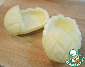 При помощи нехитрых манипуляций каждую картофелину превращаем в лапоточек. Делать это нужно побыстрее, чтобы клубни не потемнели без воды.
