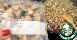 У меня основные грибы - свежие шампиньоны, но я добавила немного замороженных лесных грибов, собранных мною же в лесах подмосковья. Лесные грибы дают неповторимый аромат!