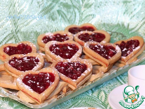 Сердечки без вырезанных отверстий смажьте брусничным соусом с помощью кисточки. Вырезанное печенье присыпьте сахарной пудрой с помощью сита. Сложите печенье, присыпанное пудрой поверх печенья с брусничным соусом.