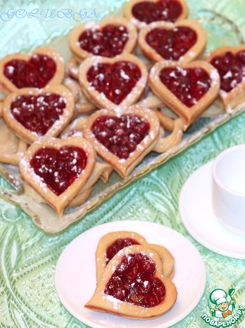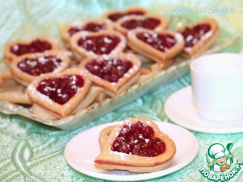 Здесь чуств. немного аромат меда и аромат кисло - слад. ягод. Сверху сахар. пудра, вообщем ее не обязательно, печенье без нее выглядит не плохо, но по консистен. нужно густое варенье или соус ягодный, верхнее сердечко держится за счет этого. А вот этот соус очень густой, ягоды только в середине, а края смазаны кисточкой