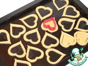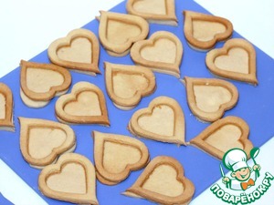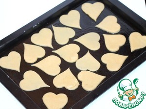Нам нужны две формочки сердечка: большое и маленькое. Большой формочкой вырежьте из теста сердечки. Разделите сердечки на две части. Первую часть отложите на смазанный маслом противень.