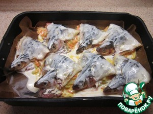 Уложить фаршированную рыбку на лист (я лист застилаю тефлоновым ковриком и тогда готовая рыбка легко снимается с листа) и сверху полить оставшимися сливками.