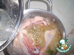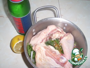Затем воду с лимоном льем в окорочка. Происходит бурная реакция. Такое впечатление, что заливается кипяток.