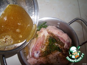 На 10 кг нужно 700 г минеральной воды и 4-5 лимонов. Но в том случае жидкость не покрывает все мясо. Поступаем таким образом. Несколько раз сливаем. -