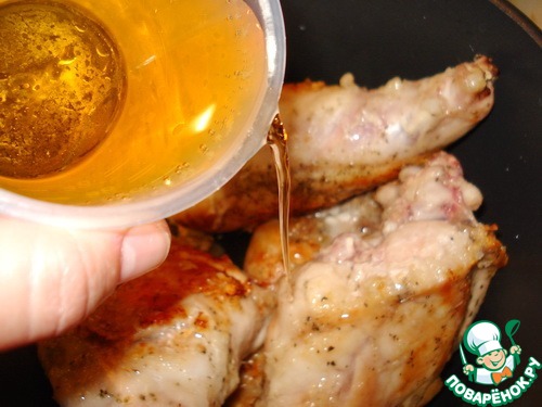 Выложить кусочки кролика в посуду для тушения, влить коньяк и 120 мл воды.