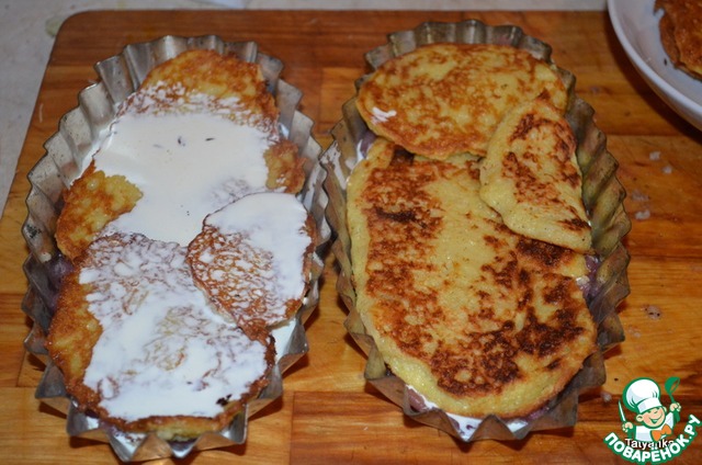 Закрываем плотно драниками, снова слегка поливаем сливками и ставим в горячую духовку минут на 20-25 до готовности мяса. Если готовите просто на противне, то каждую порцию просто положите отдельно друг от друга.