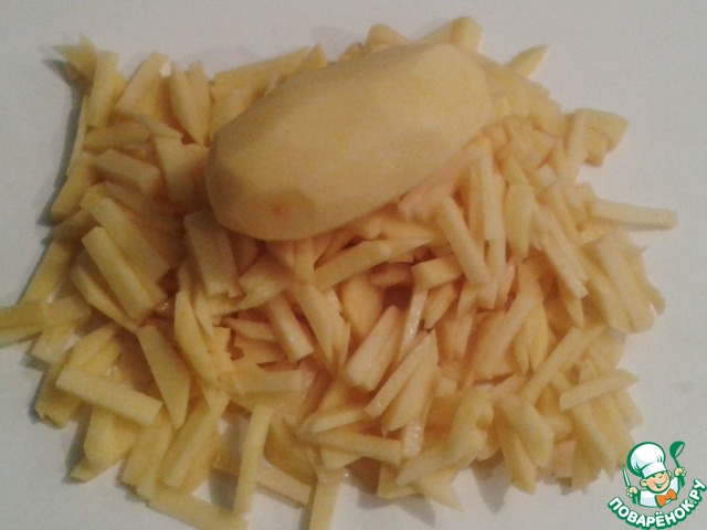 Картофель моем, чистим и режем тонкой, не длинной соломкой. Одну картофелину оставляем целой. Выкладываем в кастрюлю. Овощи с мясом варим 20 минут. И того, мясо у нас будет вариться 50 минут Для свинины этого более, чем достаточно.