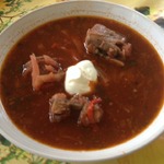 Борщ получился густой и насыщенный. В нем много мяса, овощей и зелени. Бульон тоже густой, т. к. мы положили в него затирку с протертым картофелем.