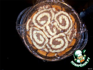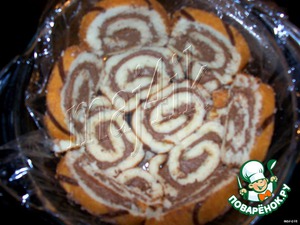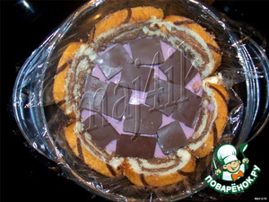 Форму застелить плёнкой и выложить по ее внутренним стенкам и дну нарезанные кусочки рулета.