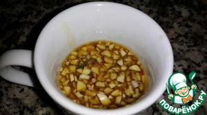 В отдельной посуде смешать мёд, лимонный сок, измельчённый чеснок, горчица. -