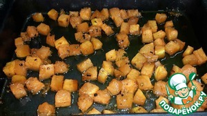 Тыкву выложить на протвень, полить 2 ст. л. мёда, посолить-поперчить, сбрызнуть маслом (нежалеючи :-) ), и перемешать (можно руками :-) ).