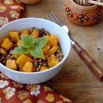 Смешать чечевицу, тыкву, мяту, соус; дать постоять минут 5. Попробовать, если надо, досолить, доперчить, докислить, досолодить.