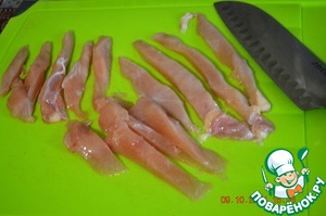 Свой 13 рецепт решила посвятить закусочным палочкам с кунжутом. Готовятся на раз-два-три, что согласитесь немаловажно, когда появляются неожиданные гости, да и на любой праздник готовить их удобно и быстро. Можно готовить из любого мяса, и набор продуктов такой, что всегда есть под рукой. Вначале планировала сделать полоски из свинины, но в холодильнике оказались только куриные грудки. Заранее извиняюсь, если подобный рецепт есть на сайте, вчера, когда забивала в поисковике "мясо, кунжут" - совпадений не показало. Блюдо делала как показательное, поэтому все ингредиенты рассчитаны на 1 порцию. Рецепт взят с сайта www.cooksa.ru.